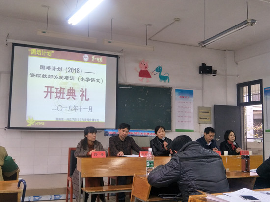 11月8日,教学点村小资深教师关爱培训小学语文1班在特立楼北103举行开班典礼。校国培办主任曾小玲、文学与新闻传播学院院长佘向军、副院长龙永干、邓姿出席了开班典礼。曾小玲介绍了一师国培工作情况,叮嘱学员安心学习,积极参与,相互沟通,共同进步,把学到的新理念带回自己的工作实践中,更好地发挥资深教师的引领作用。佘向军作为首席专家,向学员介绍了学校的基本情况,对“关爱培训”的目标和总体安排作了较为具体的说明,并强调要相互“关爱”、主动参与、共同进步。来自湘西州永顺县的尹裕才老师和来自永州市零陵区的黄姗英老师作为学员代表发言。两位学员代表表示,一定要珍惜这来之不易的学习机会,以饱满的热情、积极的态度投入到学习中,遵守纪律,认真听讲,积极研讨,及时反思,期待回到工作岗位时能真正起到引领、辐射、示范作用。