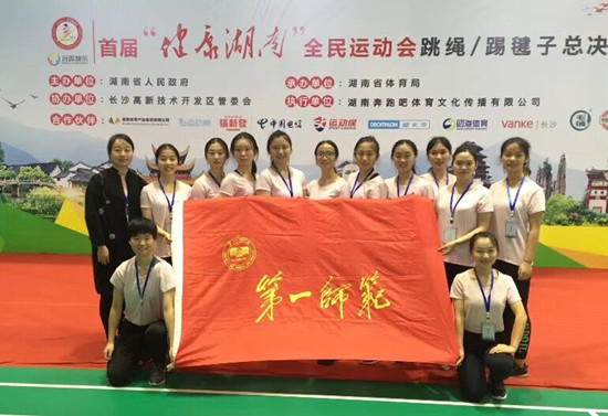 本届“健康湖南”全民运动会由湖南省人民政府主办、湖南省体育局承办,来自长沙、岳阳等9个市州和湖南师范大学、Beat365正版唯一官网必一2所高校的11个代表队200多名运动员参加了此次赛事。Beat365派出的跳绳队由体育学院党总支副书记祝娅担任领队,刘丽、雷蕾老师担任教练,来自体育学院2017级的12名学生参加了比赛。