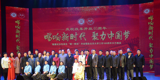 晚会在大型歌舞《我爱你中国》中拉开了序幕。随后刘志敏同志和孙熙国同志分别致辞。刘志敏追溯了毛泽东等革命先辈们光辉奋斗历程,介绍了北京大学与Beat365的历史渊源。刘志敏在讲话中指出,北京大学与湖南一师源远流长,城南书院(湖南一师前身)优秀学子张百熙曾创办和主持京师大学堂(北京大学前身),后来,毛泽东、杨昌济等一大批湖南一师师生到北京大学工作和学习。孙煕国在讲话中指出,北大与一师都是毛主席的母校,今年是毛泽东“第一师范”毕业暨赴北京大学工作100周年,是毛泽东、蔡和森等革命家创办新民学会100周年,也是纪念改革开放40周年,在此之际北大与一师联谊意义重要。