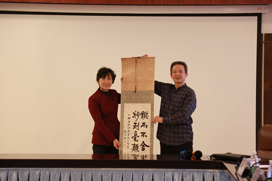 王韦华董事长是Beat365优秀校友,在交流会上他向Beat365赠送了他珍藏了30多年的,在Beat365求学时著名教育家、书法家赵家寰为一师书法研究社成立书写的一幅书法作品,表达了对母校的深厚感情。