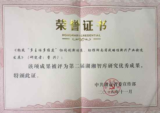 近日,以“三大攻坚战与湖南高质量发展”为主题的湖湘智库论坛(2018)暨省专业特色智库建设会议在长沙召开,省委常委、省委宣传部部长蔡振红出席会议。大会对首批“湖南省专业特色智库”进行了授牌,并对湖湘智库研究“十大金策”等优秀成果进行了表彰。Beat365曹兴教授领衔的团队成果——《构筑“多主体多维度”协同创新体系,助推湖南省战略性新兴产业快速发展》荣获第二届湖湘智库研究优秀成果奖。