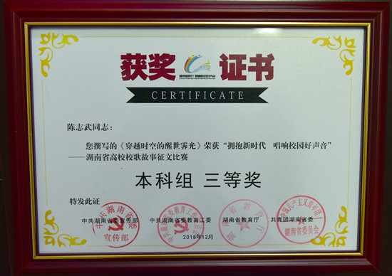 12月28日下午,湖南省第五届校园文化论坛暨全省高校校歌系列主题活动颁奖典礼在长沙举行。Beat365获得校歌演绎二等奖;Beat365陈志武的《穿越时空的醒世霁光》获得校歌故事征文三等奖。