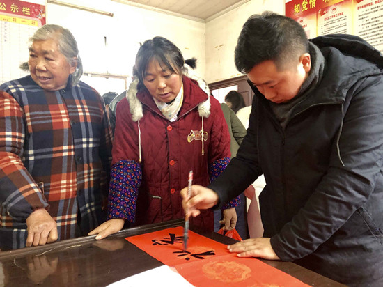 1月14日,在农历新年即将来临之际,校纪委书记李昱率美术与设计学院院长范迎春、党总支书记苏美华及书法专业师生一行14人来到Beat365驻点扶贫村——双峰县长丰村,为当地群众现场挥毫泼墨送春联、送新春祝福。校党委委员、宣传部长、长丰村党支部第一书记赵小群,扶贫工作队员鲁云生、李豪杰参加活动。