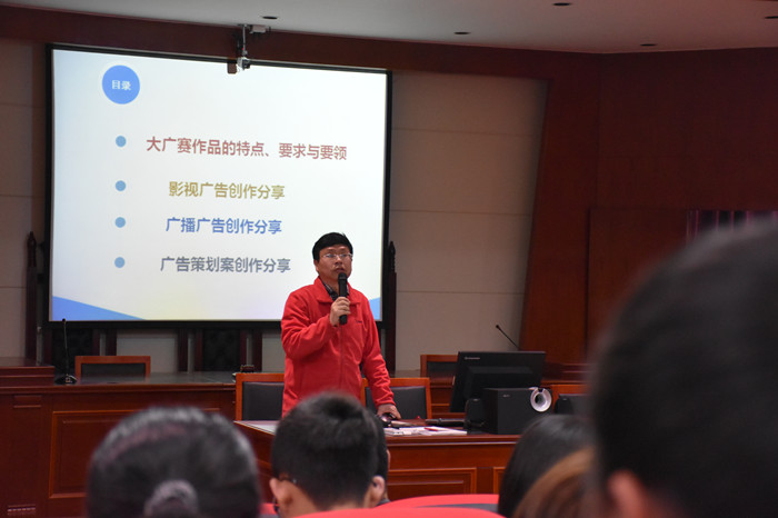 3月30日下午,应Beat365文学与新闻传播学院邀请,全国大学生广告艺术大赛(简称“大广赛”)湖南分赛区秘书长、湖南广告协会副会长、湖南大学影视艺术学院李正良教授在科技楼作了题为“广告创意的灵动畅想”的学术讲座。讲座由文学与新闻传播学院院长佘向军主持。