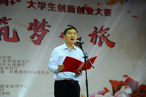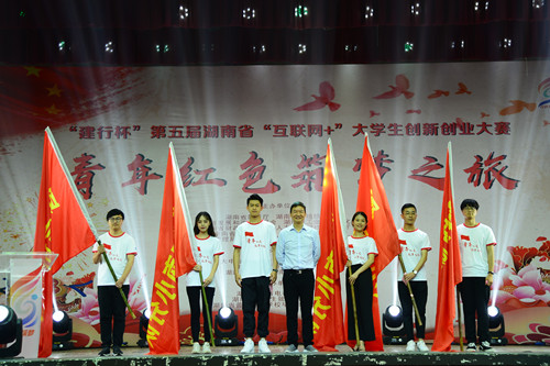 唐亚武为学生代表授旗并作了总结讲话。他指出,全省高校要准确把握高校创新创业教育与思想政治教育结合的新方向,准确把握“青年红色筑梦之旅”活动的核心要义,确保活动落到实处、取得实效。对此,他提出了三点要求:要做红色文化的忠实“传承者”,要做科教强省的奋力“建设者”,要做青春筑梦的生动“践行者”。最后,他隆重宣布“建行杯”第五届湖南省“互联网+”大学生创新创业大赛“青年红色筑梦之旅”活动正式启动!