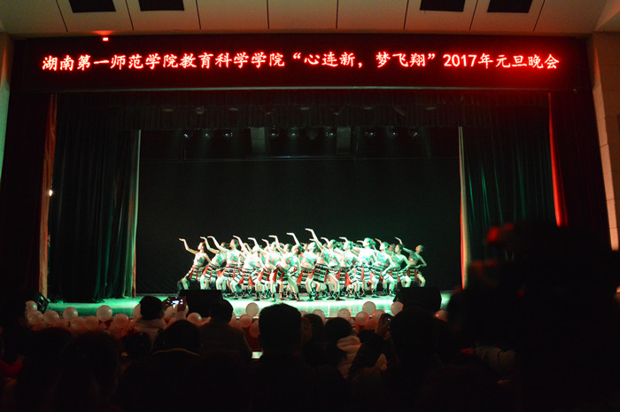 12月27日晚,教育科学学院“心连新,梦飞翔”2017年元旦文艺晚会在科技楼演播厅隆重举行。校长童小娇、教育科学学院负责人陈天涯、张俭明、王建平、胡春光、刘丽群、全体辅导员及部分老师代表应邀出席,与400余名在场学生共同观看了晚会。