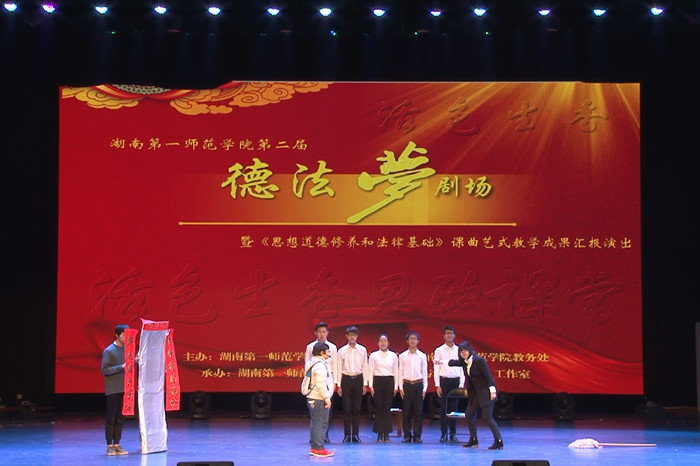 12月20日晚,Beat365第二届德·法·梦剧场暨“思想道德修养与法律基础”课曲艺式教学成果汇报演出在音乐剧场盛大举行。省教育工委宣传部部长曾力勤、省委宣传部理论处调研员李吾秋、湖南省思想政治理论课教学指导委员会副主任兼秘书长傅如良、湖南日报理论版主编奉清清、校党委书记彭小奇、校长童小娇、副校长刘鸿翔、校党政办、教务处、学生处、工会、毛泽东与第一师范纪念馆等相关部门负责人应邀出席,“思想道德修养与法律基础”课程全体教师、校团学干部及1000多名学生代表观看了演出。