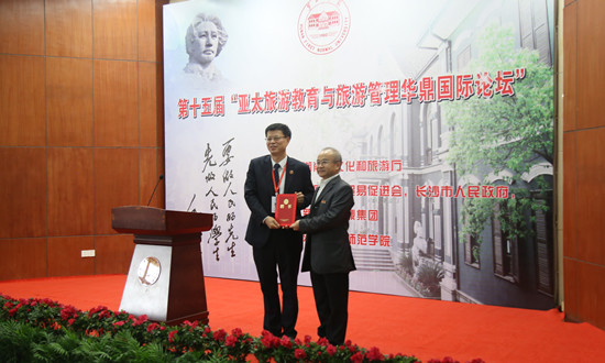 湖南省文化和旅游厅副厅长张帆介绍了湖南秀丽的山水风光、厚重的历史文化、文化旅游产业基础及区位优势,强调了乡村旅游精准扶贫工程在湖南脱贫攻坚中发挥的显著作用。他希望通过校地合作、校企合作,加强文化旅游特色学科建设,联合培养优秀人才,为推进文化旅游创新发展提供智力服务和人才保障,大力推进湖南文化和旅游事业发展。中国民族贸易促进会副会长杨秀梅以“旅游共发展”为主题,探讨一带一路与民族经济未来。杨秀梅表示,中国是多民族国家,民族地区的旅游资源丰富,文化多彩。民族地区旅游业已成为促进当地经济社会发展繁荣的重要推动力,也是民族文化传承和可持续发展的重要载体。她希望通过汇聚各方智慧,共同谋划民族地区文化旅游产业的可持续发展,使民族地区文化旅游产业展现出新的发展活力。中国民族文化旅游联盟主席、新加坡华鼎集团董事长李良义感谢各级领导所给予的支持和旅游界同行的敬业精神,介绍了华鼎国际论坛的意义,接受了彭小奇书记代表学校给他颁发的客座教授聘书。