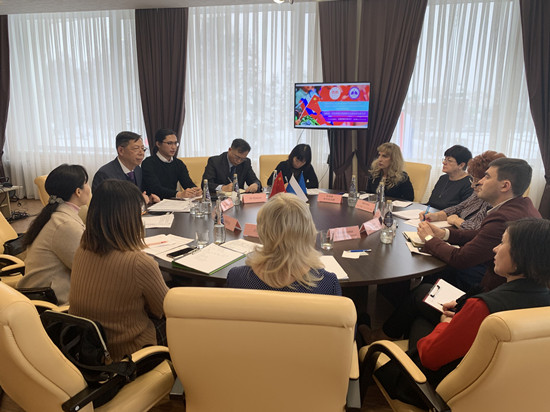 下午,代表团一行与乌里扬诺夫斯克国立师范大学外国语学院师生代表交流座谈。座谈会上,该校外国语学院院长依琳娜·格列勃金娜介绍了学院的办学历史、专业设置及学生学习汉语的成效。随后,外国语学院学生纷纷用中文向我方代表提问,从不同角度表达出愿意了解中国文化、愿意来中国学习和实习的强烈愿望。我方代表细致耐心地作出解答,会场不时爆发出阵阵热烈的掌声,历时两个小时,座谈会在友好欢乐的氛围中结束。