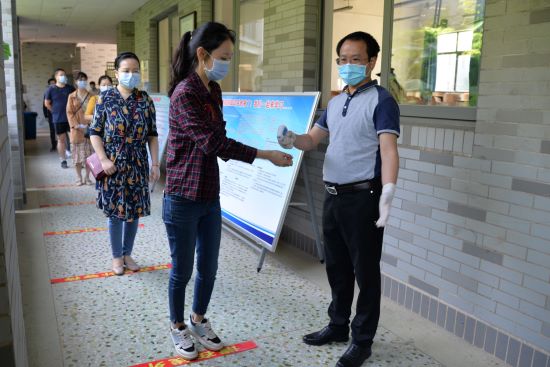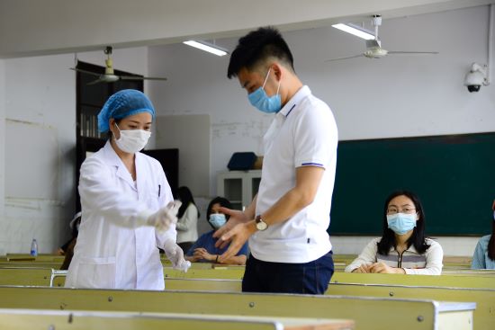 工作人员喷洒医用酒精为学生进行手部消毒