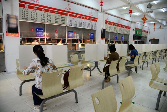 在食堂外戴口罩洗手后,按照分流指示牌要求,排队进入餐厅。师生到指定窗口排队(间距为1米以上)取餐,并在指定区域就餐。就餐时同向而坐,不面对面交谈,就餐完毕立即戴上口罩,将餐具送到指定回收处,迅速离开餐厅,食堂工作人员立即清扫用餐桌椅并消毒。食堂人员工作中与服务对象保持1米以上安全距离。三餐之间,食堂对全部餐具和就餐环境进行消毒。