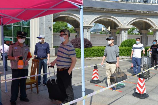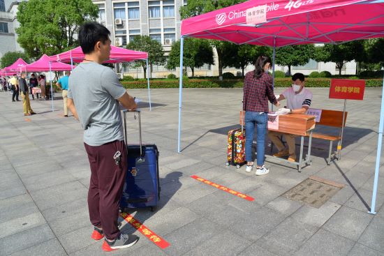 返校当天,学生佩戴口罩,排队保持1米以上间距进入校园。在校门口,工作人员喷洒医用酒精为学生进行手部消毒,核验学生身份证、校园卡或学生证,并进行体温测量,确认体温正常方可入校。学生将返校途中所戴口罩放入专用回收桶。进入学校后,学生径直来到校门口后广场,将返校前一天电子健康卡(绿码)及返校前21天行踪与健康情况报告卡递交给其所在学院辅导员,并更换佩戴新口罩。