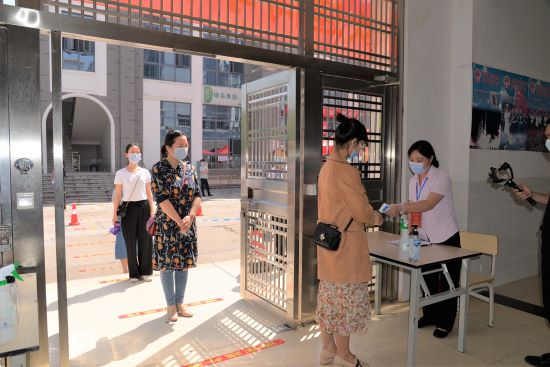 学生佩戴口罩进入教学楼,间隔1米距离,依次到达教室门口测量体温。任课教师佩戴口罩站在1米开外,提醒学生们有序进入教室,在贴有姓名贴的课桌就座,检查教室门窗是否全部打开,并询问同学们是否有人感到不适,交代同学们上课期间的注意事项。