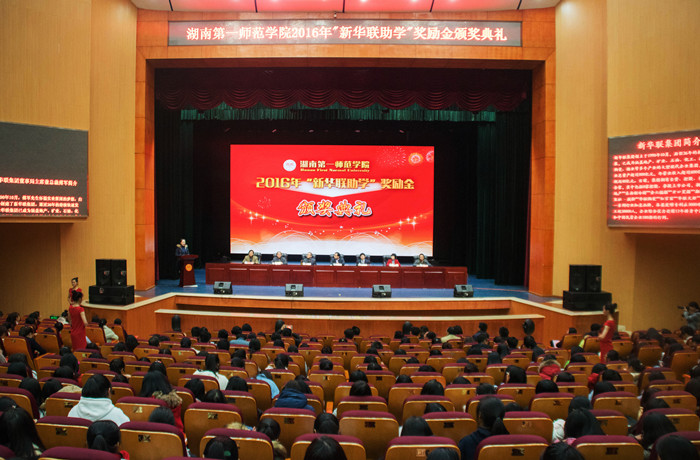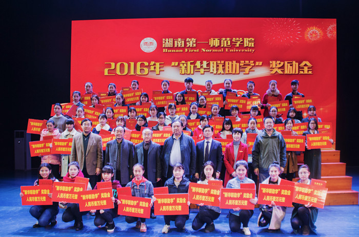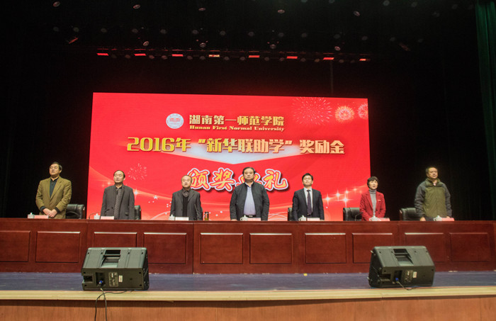 童小娇校长宣布了《关于表彰2016年度“新华联助学”奖励金获得者的决定》。新华联集团嘉宾及学校领导为获得2016年度“湖南一师·新华联助学”奖励金的同学颁发了奖金和证书。获得“新华联助学”奖励金的学生代表、外国语学院2014级英语7班唐佳文同学作了发言。