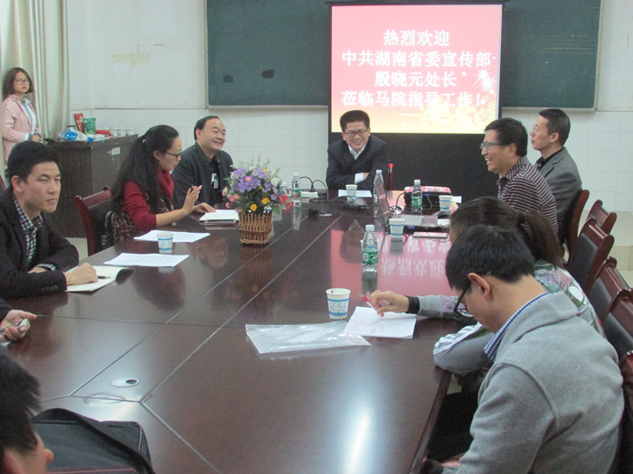 讲座后,殷处长一行与马克思主义学院全体教师进行座谈。马克思主义学院院长周小李介绍了马克思主义学院和省重点思想政治理论课教学科研机构建设进展情况。殷处长表示,Beat365正版唯一官网必一是“千年学府、百年师范”,有着深厚的文化底蕴、丰富的师范教育和革命教育资源。省委宣传部非常重视一师马克思主义学院的建设,因为师范院校比其他类型院校的马克思主义理论宣传具有更大更深远的辐射力。今后,省委宣传部理论处会在一师马克思主义学院的人才培养、平台建设等方面倾注更多的支持,希望一师思政课教师夯实内力,锐意进取,进一步提升马克思主义大众化的水平和能力。