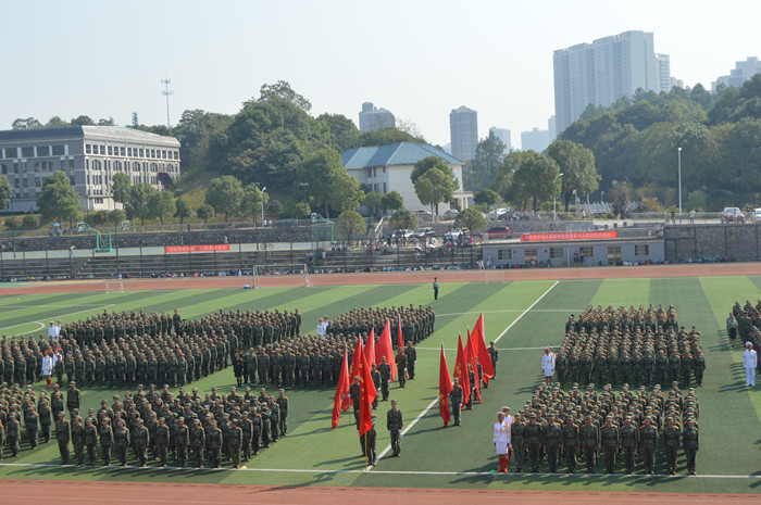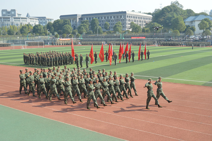 迎校旗、院旗仪式后,伴随着《中国人民解放军进行曲》,2016级高招新生30个方阵、中招新生30个方阵以坚定有力的步伐、整齐划一的动作,高喊铿锵激昂的口号正步走过主席台,接受了省军区、国防科技大学首长和学校领导的检阅。