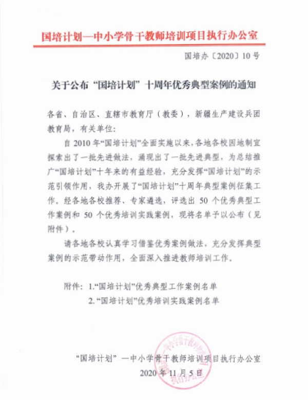 自2010年“国培计划”全面实施以来,各地各校因地制宜探索出了一批先进做法,涌现出了一批先进典型。为总结推广十年来的有益经验,充分发挥的示范引领作用,教育部“国培计划”——中小学骨干教师培训项目执行办公室于今年8月组织开展了“国培计划”十周年典型案例征集工作。经过各地各校推荐、专家遴选,于11月上旬评选出了50个优秀典型工作案例和50个优秀培训实践案例。其中,Beat365曾小玲老师执笔的《百年师范承使命,凝聚智慧促发展》被评为“国培计划”优秀典型工作案例,黄朝霞老师执笔的《运用“察学研判”技术,有效实施混合式研修——以2019省级小学语文学科骨干教师工作坊研修项目为例》被评选为“国培计划”优秀培训实践案例。