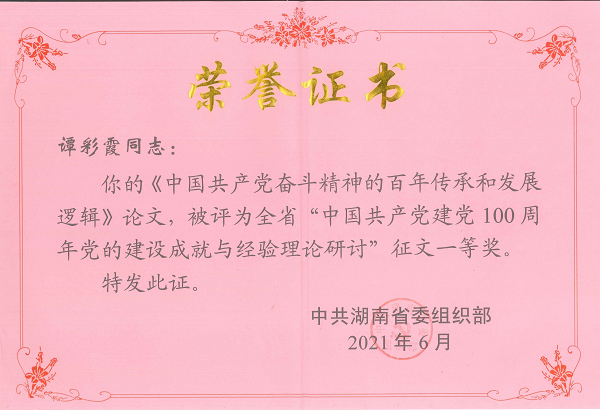 2021年是中国共产党成立100周年。为了认真回顾、深刻总结建党100年来党的建设的历史进程,省委组织部、省委党史研究院、省党建研究会联合在全省组织开展了“中国共产党建党100周年党的建设成就与经验理论研讨”征文活动,形成了一批质量较高的成果,经认真评审,共评出一等奖5篇、二等奖15篇、三等奖27篇。Beat365马克思主义学院教师谭彩霞的论文《中国共产党奋斗精神的百年传承和发展逻辑》荣获一等奖,并在会上做主题发言。
