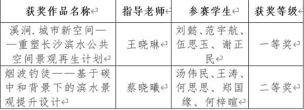 12月19日,由湖南省教育厅主办、中南林业科技大学承办的“第二届湖南省大学生风景园林学科竞赛”圆满结束。Beat365美术与设计学院代表队在省内30所高校代表队的274组作品中脱颖而出,获一等奖1项,二等奖1项。