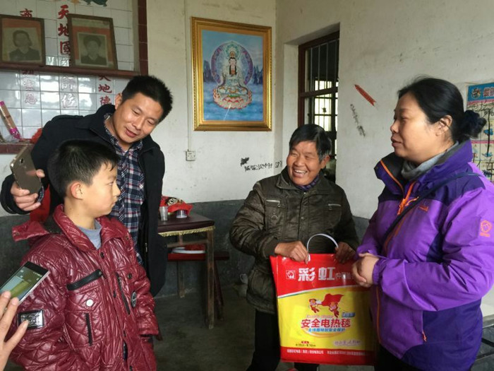在听取扶贫工作队对扶贫点的基本情况、扶贫规划及已开展的各项工作的介绍后,一行人来到学院帮扶对象——五保户王东华老人家中,为老人送去大米、食用油和电饭煲,为他添置了新棉衣、棉裤、棉鞋、棉被。考虑到他家没有一样像样的家具,一行人又到附近的家具店买了新床、衣柜及桌子,并一起动手帮助他清理破旧的家具和衣物,重新把家布置好。随后,一行人又驱车赶往荷叶镇敬老院看望另一位帮扶对象曾建和老人,与他亲切谈心,了解他的生活情况及身体状况,并送去慰问金。