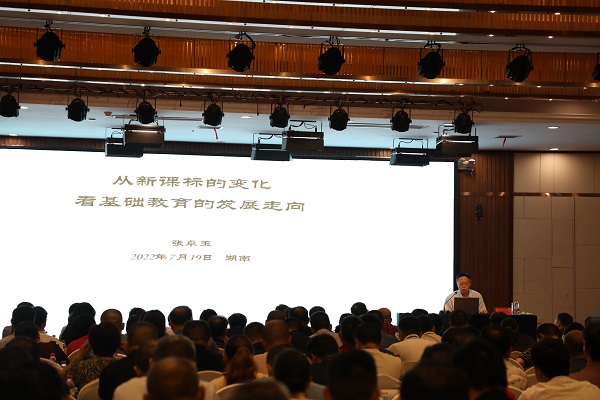 开班报告后,教育部基础教育教学指导委员会副主任委员张卓玉作了《从新课标的变化看中小学教育的发展走向》的主题报告。张教授从课程方案、课程标准的主要变化、教学内容的变化、教学方法的变化等方面阐述了中小学教育的发展走向,并从教育行政部门、学校、教师、教学等层面提出落实新课标的具体建议。