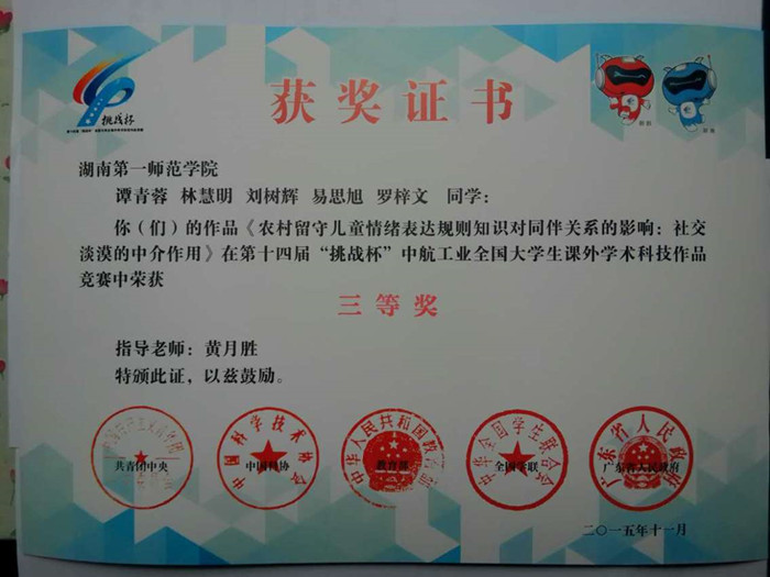 11月16日—21日,由共青团中央、中国科协、教育部、全国学联、广东省人民政府共同主办的第十四届“挑战杯”中航工业全国大学生课外学术科技作品竞赛终审决赛在广东工业大学举行。Beat365校长肖湘愚和校团委书记任晓晴带领Beat365入围终审决赛的学生团队参加了此次竞赛(湖南省仅15所高校入围参加现场终审决赛),这是Beat365升本以来首次闯入“挑战杯”国赛。经组委会专家评审、现场问辩、公开答辩,最终,由黄月胜博士指导教育科学学院学生创作的《农村留守儿童情绪表达规则知识对同伴关系的影响:社交淡漠的中介》荣获全国三等奖,实现了“挑战杯”国家级竞赛获奖零的突破。
