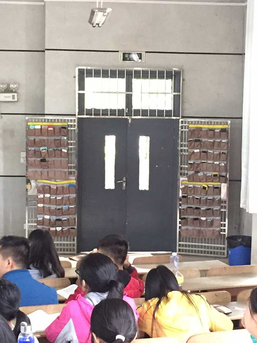 学生上课低头玩手机,不认真听讲,学习跟不上,容易产生厌学情绪,特别是对理工科学生来说尤其如此。如何破解这一困局?数学与计算科学学院开展了学生上课向手机说“不”的活动,并在2015级新生课堂上试点开展学生手机入袋工作,即在固定地点放置手机袋,称之为“手机客栈”,上课前,学生自觉将手机放入袋中。