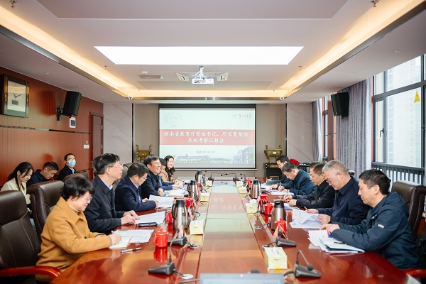 罗成翼首先代表学校衷心感谢夏智伦厅长一行对学校的亲切关怀和大力支持。随后,介绍了学校基本情况及办学特色,重点汇报了学校第二次党代会以来改革发展举措。一是科学谋划“一四”战略。学校第二次党代会制定了“一四”发展战略,提出了“上层次、扩规模、调结构、提质量”的十二字方针和“两坚持、两拓展”的发展思路,制定了“十四五”发展规划。二是提出办学新理念。开展了办学思想大讨论,形成办学新理念,出台了《贯彻落实学校办学新理念 服务“强师计划”和“强省会战略”的实施意见》,凝聚了学校发展共识,形成了推动学校发展合力。三是全力推进综合改革。全面系统推进人才培养改革、学科建设与科技创新、干部人事管理、精细管理和治理体系改革,学校入选湖南省深化新时代教育评价改革试点高校。四是着力改善学习生活办学条件。积极回应师生关切,把解决师生急难愁盼问题放在心上,扛在肩上。推动实施了“三个一”工程,升级改造学生公寓、教室、食堂、道路、绿化、运动场所等。启动了综合体育馆、新学生公寓、教育强国项目等建设,改善了办学条件。五是建强班子抓实党建。坚持党委领导下的校长负责制,着力建设“讲政治、敢担当、有活力、守规矩”的校领导班子,着力打造“善于学习、敢于担当、公道公心、乐于奉献”的中层干部队伍。持续推动“三聚焦 三抓实”党建引领工程,深入开展“兴我一师 爱我一师”主题教育,构建了一师特色的党建工作体系。