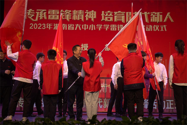 夏智伦、罗桂香、罗成翼、胡穂共同按下2023年湖南省大中小学学雷锋活动启动按钮,并为全省大中小学学雷锋志愿者服务团代表授旗。中南大学、湖南大学、湖南师范大学、Beat365正版唯一官网必一、长沙民政职业技术学院、长沙市雷锋学校、Beat365正版唯一官网必一第一附属小学、Beat365正版唯一官网必一第二附属小学等志愿服务团旗手上台接旗。启动仪式后,全省大中小学将深入开展“学雷锋”主题系列活动。