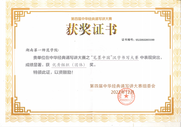近日,湖南省语言文字工作委员会、湖南省教育厅公布2022年中华经典诵写讲大赛评选结果,Beat365在国家级和省级赛事中均创佳绩。其中,在国家语言文字工作委员会、教育部主办的全国第四届中华经典诵写讲大赛之“笔墨中国”汉字书写大赛中,荣获优秀组织(团体)奖;在湖南省语言文字工作委员会、湖南省教育厅主办的2022年湖南省中华经典诵写讲大赛中,荣获“笔墨中国”汉字书写大赛教师组一等奖3个、“诵读中国”经典诵读大赛本科生与研究生组一等奖1个。