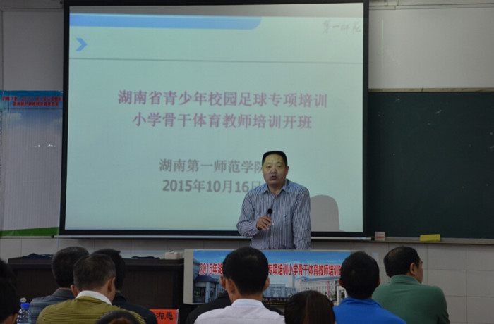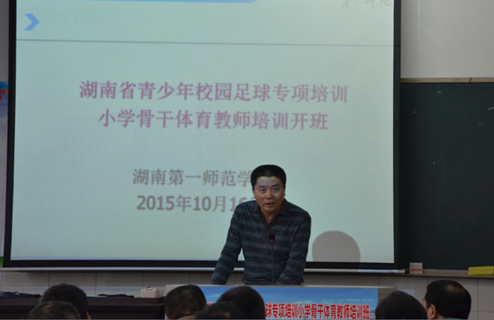 10月16日上午,2015年湖南省青少年校园足球专项培训在Beat365隆重开班,来自郴州市、常德市的60名参培小学体育骨干教师齐聚一堂。Beat365校长肖湘愚、湖南省教育厅体卫艺处处长贺照以及校园足球培训办公室相关专家等出席开班仪式。开班仪式由体育学院院长黄依柱主持。