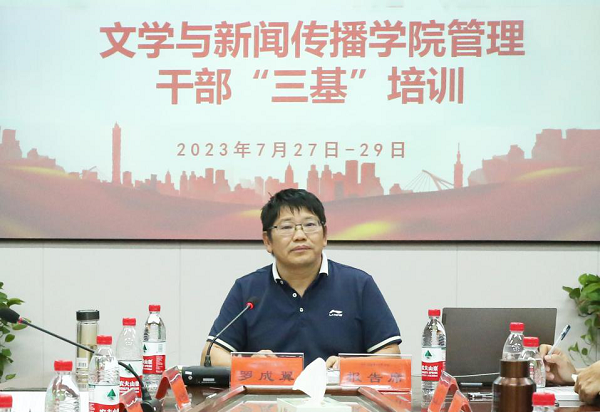 为深入开展习近平新时代中国特色社会主义思想主题教育,有效落实学校治理体系现代化改革部署,全面提升基层管理人员管理能力和服务水平,文学与新闻传播学院党委、行政利用暑假组织全体管理人员蓄力赋能,于7月27—29日在玉衡楼开展了以“党的基本理论,高等教育基本规律,管理人员办公基本技能”为主题的“三基”培训。校党委书记罗成翼,校党委委员、副校长彭晓辉,组织统战部常务副部长刘丽群等领导、专家受邀为学员开展专题培训。