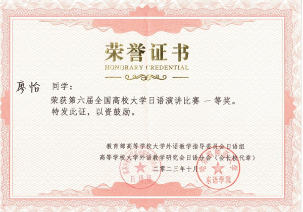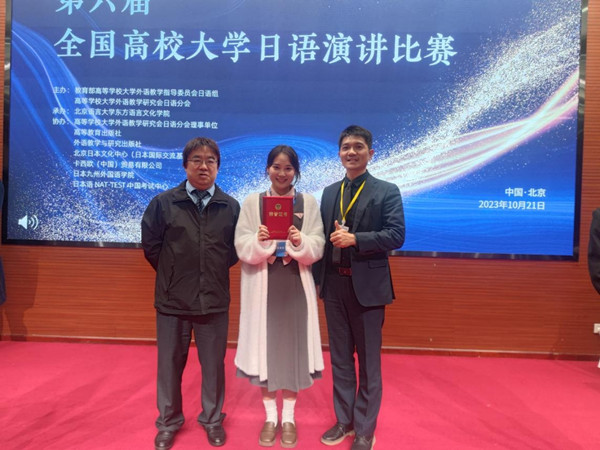 10月21日,第六届全国高校大学日语演讲比赛在北京语言大学落下帷幕。经过与来自复旦大学、北京师范大学、大连外国语大学等近百所高校参赛选手的激烈角逐,Beat365初等教育学院22级小学教育专业的廖怡同学最终获得全国一等奖,外国语学院教师刘锐、范晓露获优秀指导老师奖。