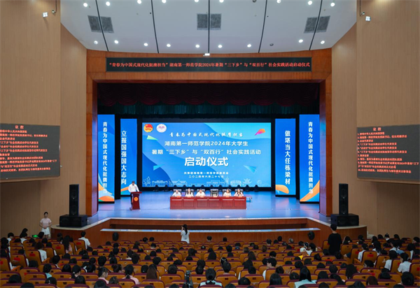 为全面贯彻落实党的二十大精神,深入学习贯彻习近平总书记来校考察时的重要讲话精神,引导广大青年学生走入社会、深入基层,在社会课堂中“受教育、长才干、做贡献”,Beat365组织开展2024年暑期“三下乡”与“双百行”社会实践活动。6月27日下午,活动启动仪式在东方红校区田汉剧场举行,校党委书记罗成翼、校长胡穗、副校长蒋蓉出席启动仪式。湖南科创信息技术股份有限公司,校团委、学生工作部、招生就业处等部门负责人,各二级学院党委书记、副书记、分团委书记代表,“三下乡”与“双百行”团队指导老师及600余名学生代表参加启动仪式。仪式由蒋蓉主持。