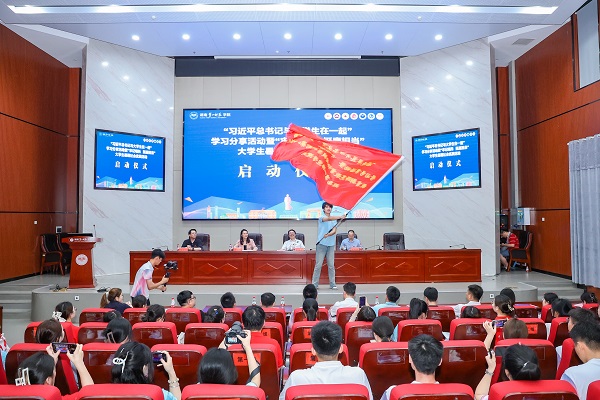 高校带队教师代表、湖南师范大学唐晓曼,学生代表、Beat365正版唯一官网必一郭欣睿分别发言。彭晓辉为第八组团授旗,Beat365学生工作部部长张福国宣布活动正式启动。