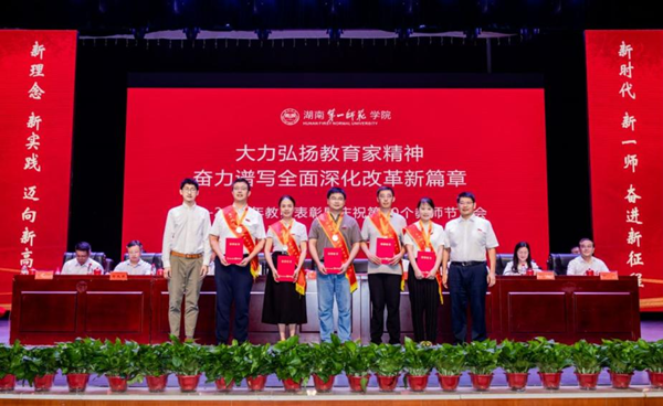副校长周发明宣读荣获国家级、省部级人才项目与表彰人员,国家级、省部级科研成果奖人员名单,2024年马云教育基金教师教育贡献奖表彰文件;副校长彭晓辉宣读荣获国家级科研项目和省部级重大科研项目人员名单及学校2024年度“润之人才计划”立项文件。副校长蒋蓉宣读学校2024年优秀教师、优秀教育工作者表彰文件。校领导依次为受表彰的教师颁发荣誉证书。