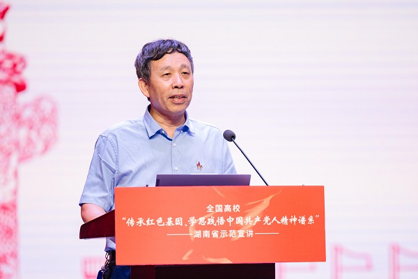 党史研究专家、湘潭大学毛泽东思想研究中心主任李佑新教授以《中国共产党人精神谱系的重大意义》为题,从中国共产党人精神谱系是中国共产党辉煌历史铸就的永恒精神丰碑、中国共产党人精神谱系给我们留下了永恒的英雄榜样、中国共产党人精神谱系蕴含着中国共产党宝贵的精神品质、中国共产党人精神谱系是激励我们前进的永恒精神动力、要下大力气研究和弘扬中国共产党人精神传统五个维度剖析了精神谱系的深远影响,阐明了研究和弘扬中国共产党人精神传统的紧迫性和重要性,倡导广大共产党员应保持政治本色,传承光荣传统和优良作风。
