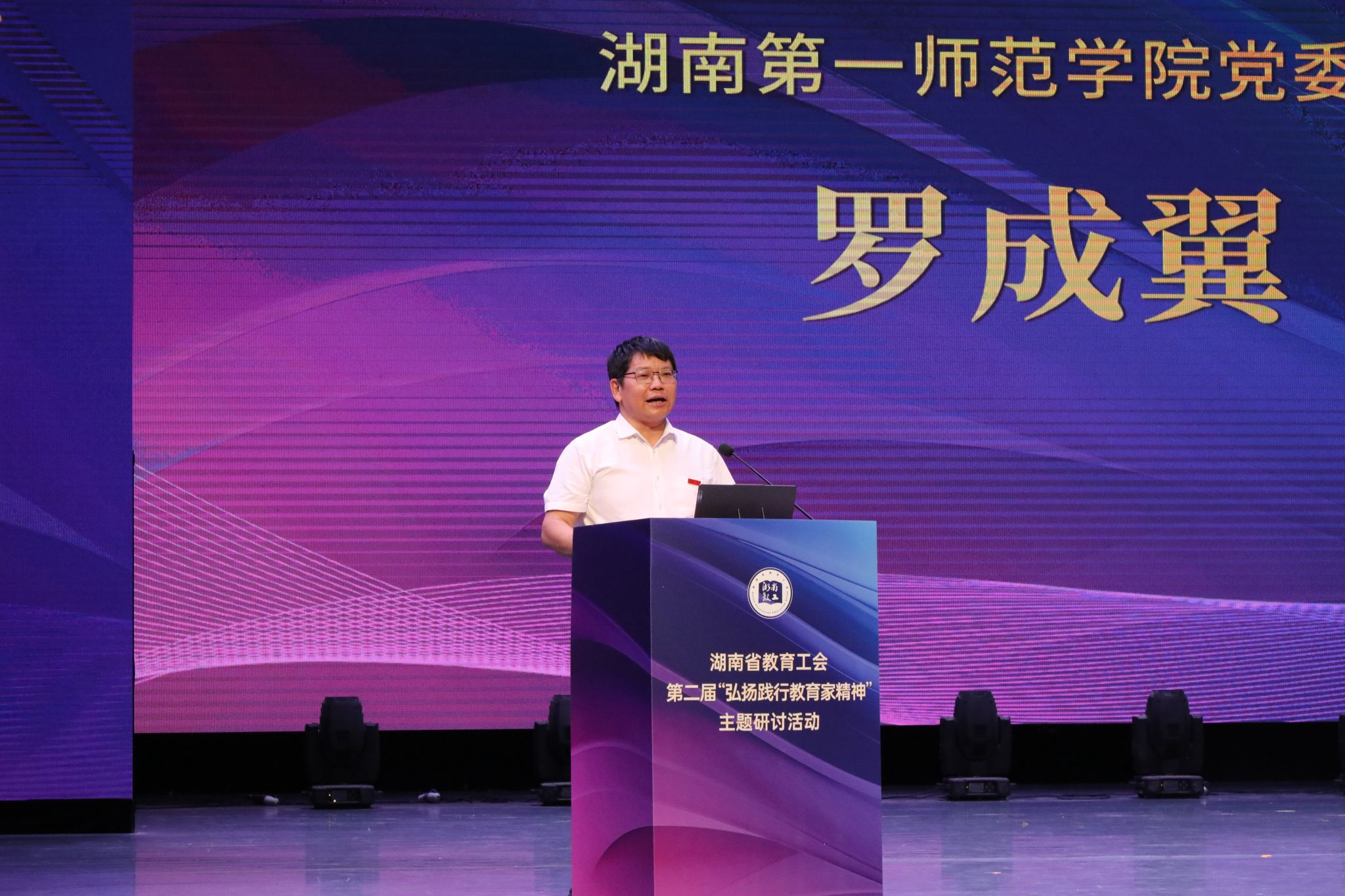 罗成翼在致辞中深情回顾了学校的百年师范教育传统与新时代“强师兴教”的使命担当,杨昌济、徐特立等湖湘教育家始终以红色精神为底色,将教育家精神融入立德树人的血脉,培养了毛泽东、何叔衡、蔡和森等一批“改造中国与世界”的栋梁之材;新时代一师人以“大思政”育“大先生”、以“一师红”铸“青春红”,把学校打造成弘扬践行教育家精神实践高地。