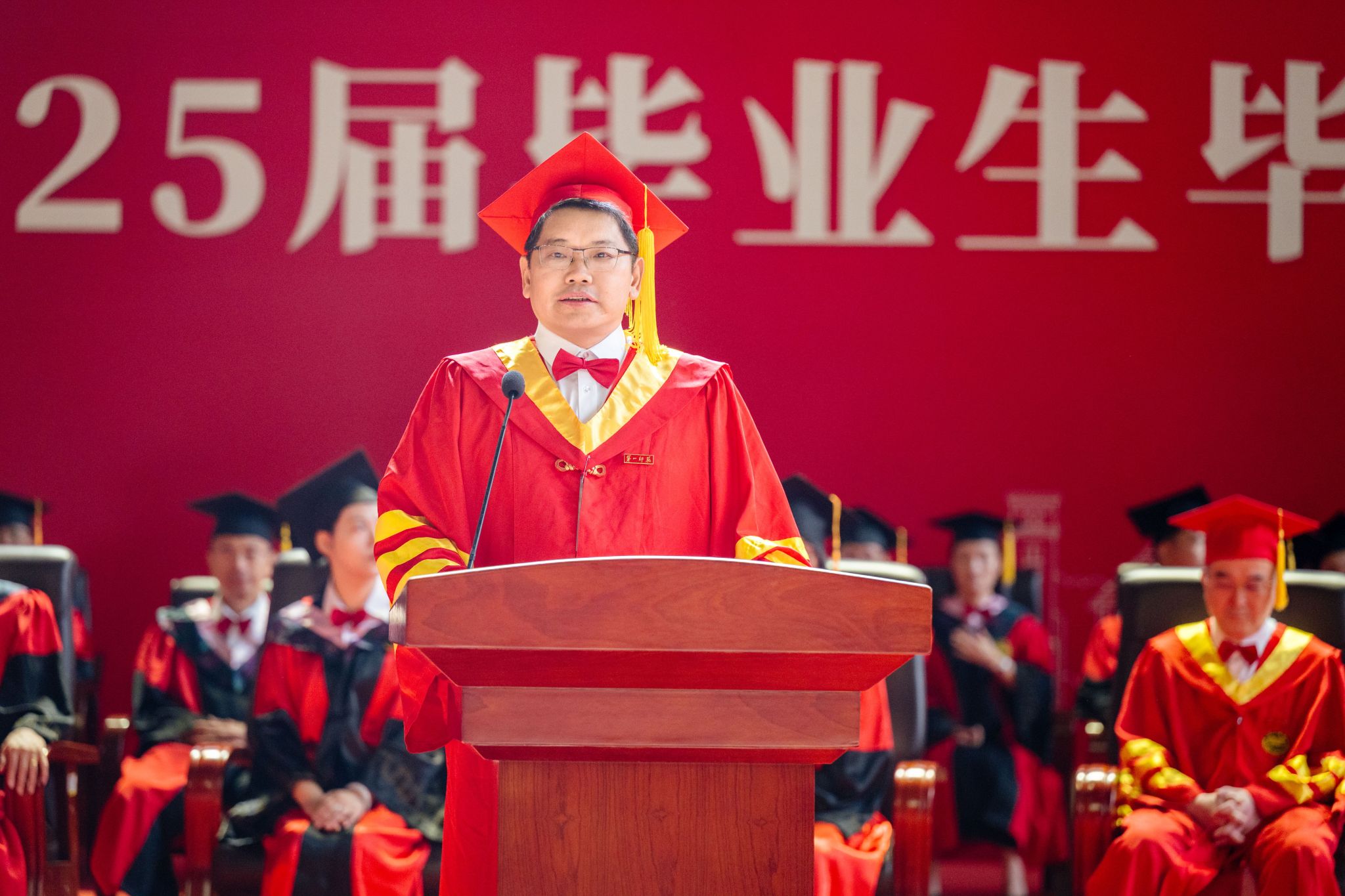 在热烈的掌声中,罗成翼代表学校致毕业贺辞,向即将奔赴祖国各地建功立业的2025届毕业生表示热烈的祝贺和美好的祝愿,向为他们成长成材付出辛劳的各位老师和家长,致以衷心的感谢和崇高的敬意。2025届毕业生是学校“一四”战略全面实施的首届毕业生,是承载着特殊使命的一届学生。罗成翼深情回忆了毕业生在校期间践行办学新理念、共同见证和创造学校跨越式发展的一个又一个高光时刻,重温了习近平总书记亲临学校视察时的殷切嘱托,以及百廿校庆的荣耀,学校办学层次实现历史性突破的自豪,考研录取率从6.39%跃升至22.24%、招生规模扩大但录取分数线却稳居高位的欣慰,还有一师红墙、新体育馆、新工科楼、新宿舍楼等文脉味与现代风交融的校园新地标拔地而起、学习生活环境不断优化的幸福。