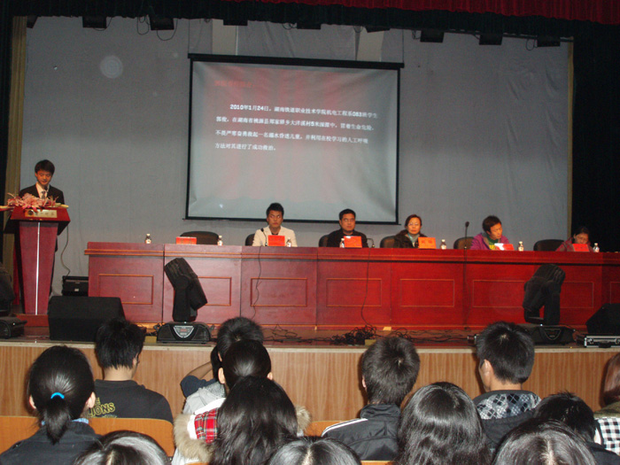 4月19日晚,“湖南省见义勇为优秀大学生”郭俊应邀在我院东方红校区科技楼演播厅为我院数理系全体师生做了一场先进事迹报告会。院党委宣传部陈志武部长、数理系阎颖主任、学生处吴涛科长、数理系团总支赵秀青书记、辅导员刘燕舞老师和成夏炎老师以及郭俊现就读学校的同学汪绍金、候志宇、杜欢、王楠等出席报告会。