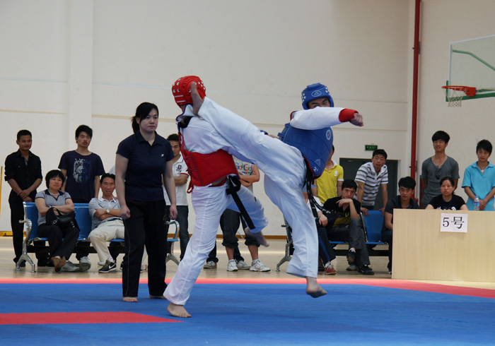 为了提高广大业余跆拳道爱好者技术水平,增进高校间的相互交流,全面推广跆拳道运动,5月1日—2日,我院体育系联合湖南人文科技学院、湖南城市学院、衡阳师范学院、湖南文理学院、吉首大学、湖南科技学院、怀化学院、广东湛江师范学院等十大高校举办了2010年湖南省高校跆拳道邀请赛暨中国国家跆拳道示范团选拔赛,我院健儿荣获竞技实战六个第一,品势一个第一。