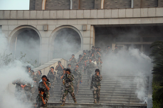 9月17日下午6:00,音乐剧场突然响起一阵急促的警报声,广播里传来“同学们,剧场突发火情,请大家在教官的带领下从安全出口紧急疏散!”随即,只见同学们弯腰低姿,沿着墙壁快速地从剧场的五个安全出口冲了出来。随着教官的点评:“从突发火情到疏散至安全地点整队集合完毕,用时1分58秒!”至此,历时两周的学生入学安全教育划下了圆满的句号。
