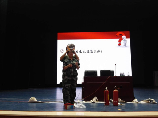 讲座结束后,随即在现场进行了疏散逃生演练。模拟会场突发火情,同学们在安保人员的引导下,弯腰低姿快速冲出“火场”。