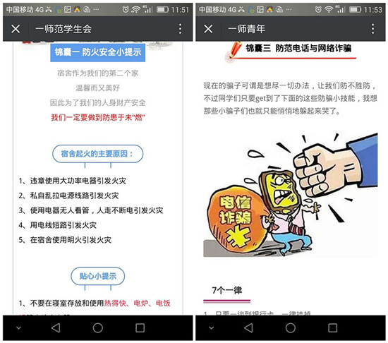 校党委宣传部、校团委、校学生会等部门利用微信、微博等网络新媒体推送安全知识,更易于被同学们接受。