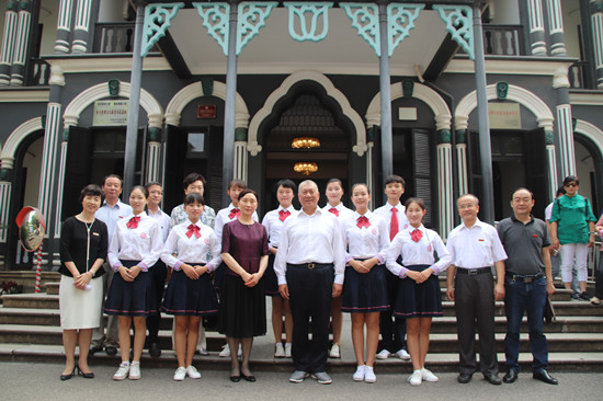 听完讲解后,何厚铧与每一位学生讲解员亲切握手,并主动提出与纪念馆工作人员及学生讲解员合影留念。
