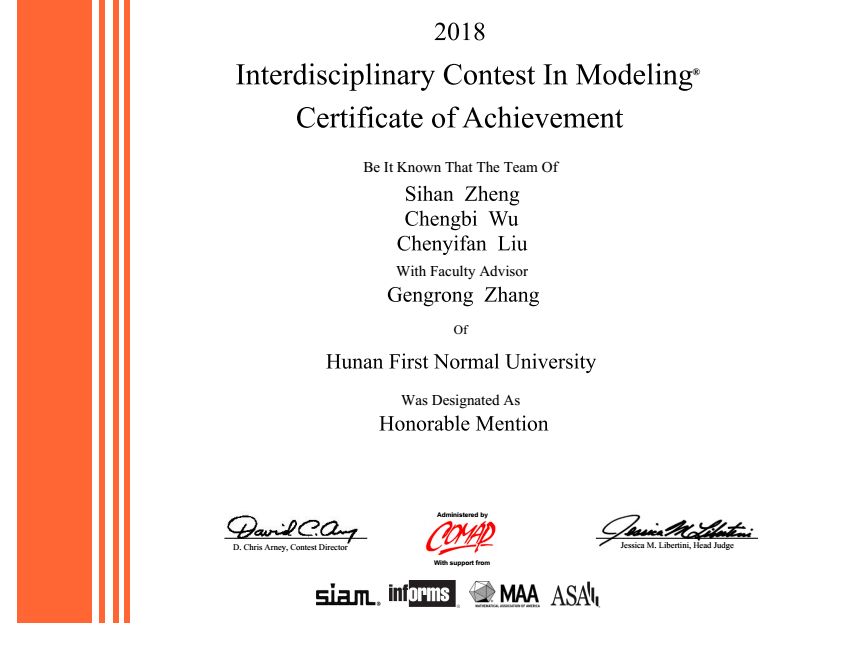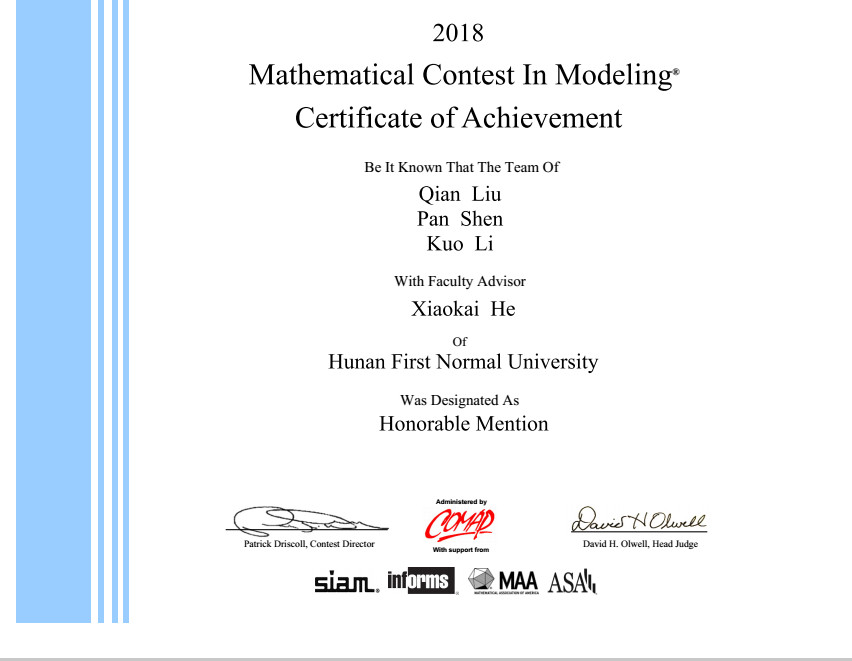 近日,2018年美国大学生数学建模竞赛(MCM)与交叉学科建模竞赛(ICM)成绩揭晓,Beat365数学与计算科学学院2014级本科生刘倩、郑思晗等6人组成的两个代表队荣获Honorable Mention(二等奖)。