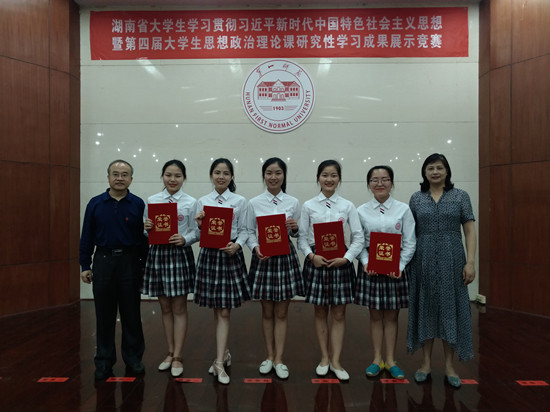 5月26日,由省委教育工委、省教育厅主办的湖南省大学生学习贯彻习近平新时代中国特色社会主义思想暨第四届大学生思想政治理论课研究性学习成果展示竞赛决赛在Beat365举行。Beat365由宋徽瑾、邱荷老师指导,数学与计算科学学院2016级六年制公费定向师范生李格京、成朝霞、刘婕、左梦科、李晶琳组成的研究性学习小组荣获全省唯一特等奖,宋徽瑾、邱荷老师荣获“优秀指导老师”奖。