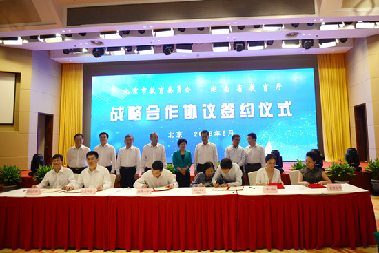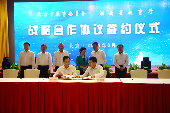 为了更好地发挥北京市和湖南省教育区域优势,湖南省教育厅决定与北京市朝阳区人民政府开展教育领域合作。6月1日,北京市朝阳区与湖南省教育厅正式签署合作协议,建立战略合作关系。6月2日,北京市教育委员会与湖南省教育厅战略合作协议在北京签订。湖南省副省长吴桂英、北京市副市长王宁出席签约仪式。北京市教委主任刘宇辉,湖南省教育厅党组书记、厅长、省委教育工委书记蒋昌忠代表签约双方讲话。教育部基础司副司长俞伟跃,省政府副秘书长彭翔,省教育厅党组副书记、副厅长、省委教育工委副书记夏智伦等领导参与签约仪式。