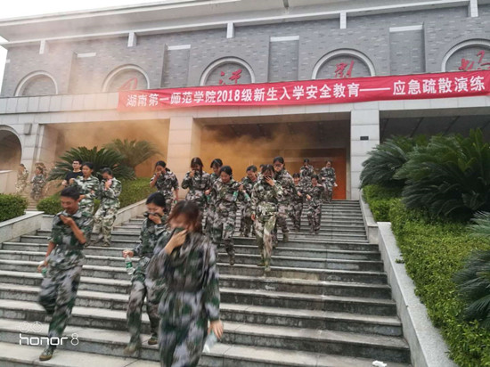 在东方红校区和城南书院校区,模拟会场、教学楼突发火情,开展了应急疏散演练。同学们在安保人员的引导下,弯腰低姿快速冲出“火场”。