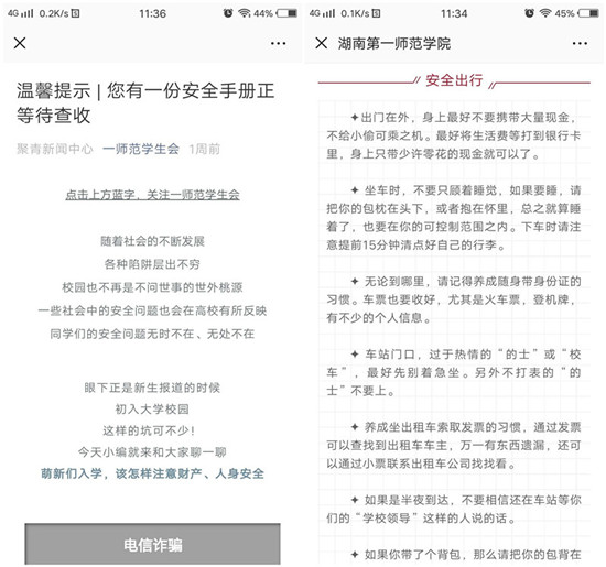 报到当天向每一位新生发放了《大学生活指南》和《新生入学安全提示》,采用微信、QQ群、横幅、电子屏等形式多渠道开展安全预警与宣传。
